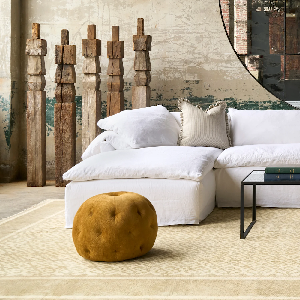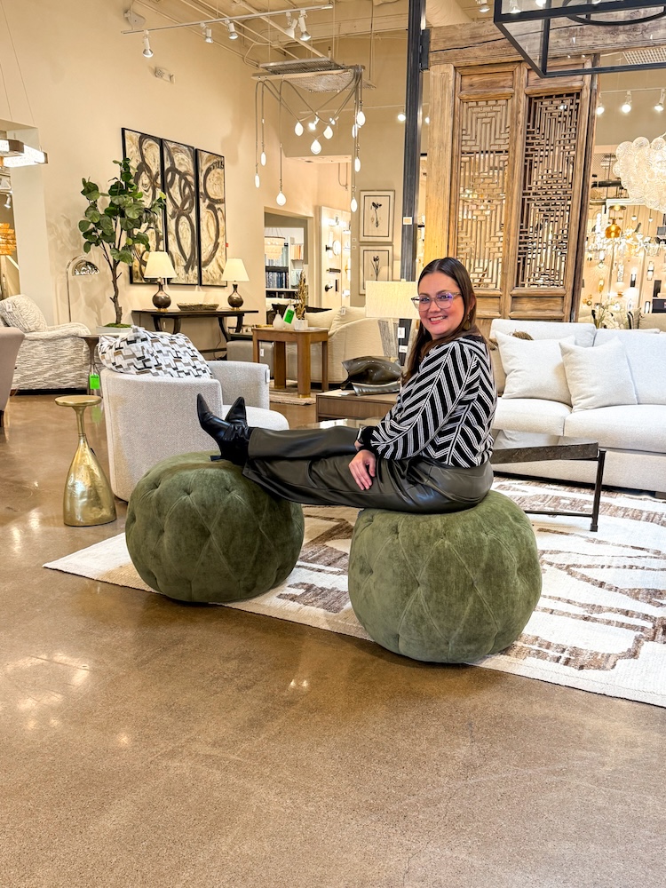 The Pouf Ottoman by CiscoHome is my favorite find. We have two shown in our Scottsdale showroom in a beautiful green velvet and tufted detail. The ottoman comes in different sizes and many fabric options and is made in the USA.
