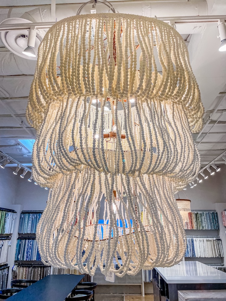 The beautiful flowering branches of the Fiori Chandelier by Lib & Co. are finished in gold leaf with intricate glass blossoms in clear and frosted white glass. Each petal is delicately shaped to catch and diffuse the light. The 2 colors of flowers provide a layered, ethereal glow. It’s a showstopper and certainly caught my eye!