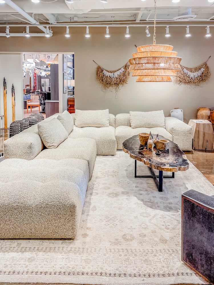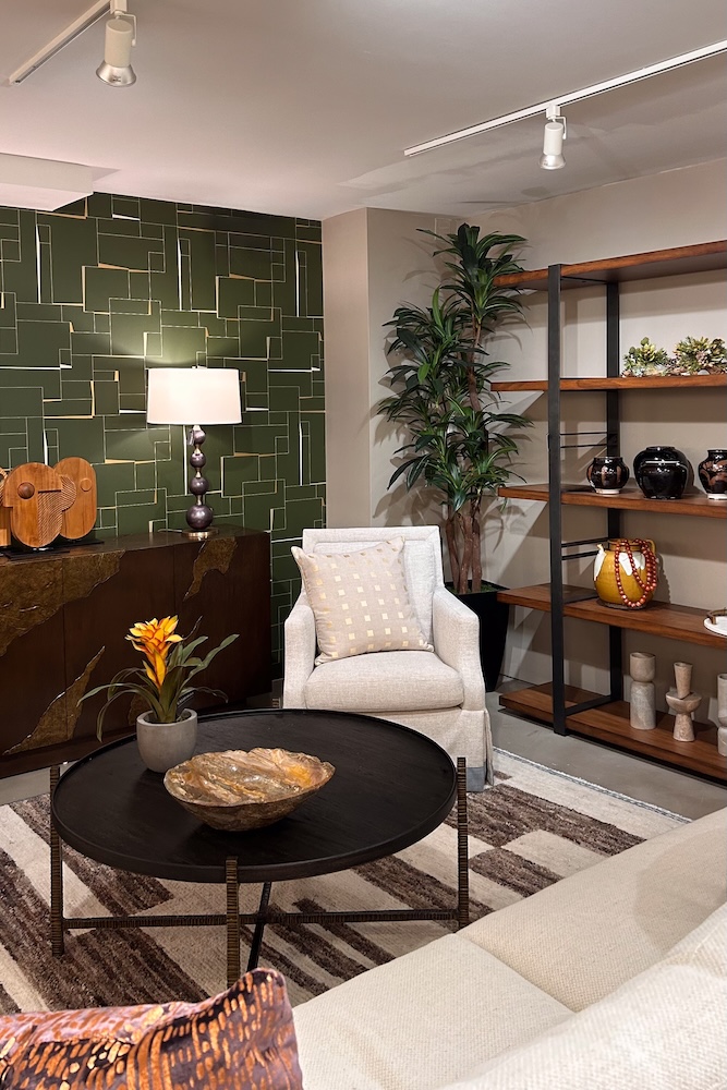 This color also pairs well with different styles. In Scottsdale, it is paired with a grass cloth wallcovering in a more natural, textural vignette. For Chicago, it is paired with a bold colorful geometric print wallcovering in a refined mid-century vignette. Stop by our showrooms to check out our new favorite color.”