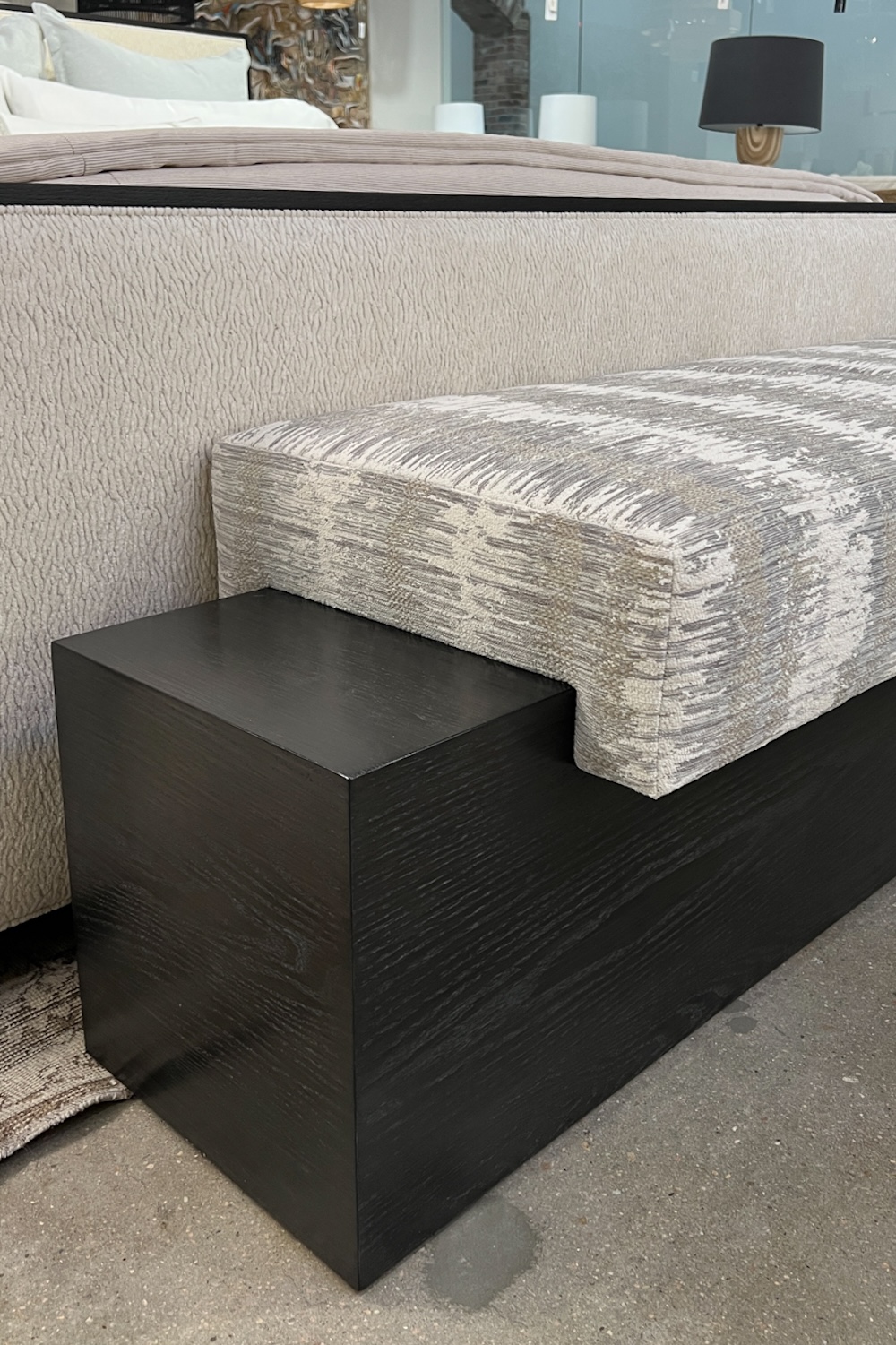 The London bed features a wood trim detail on the headboard and footboard. There are three headboard heights to choose from, which makes this bed accommodate many different spaces. We decided to go with the Low headboard for our showroom. We paired the London bed with the Del Toro bench, which is also by Rene Cazares. The bench has a generous cushion that is very comfortable and a beautiful wood base that can be customized into different lengths to suit each project.