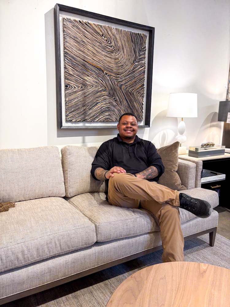 The Wesley Hall Peretti Sofa is my favorite find. It’s comfortable – football viewing approved. I appreciate the details; such as the cushioned track arm and exposed wood along the base. Wesley Hall offers a wide array of fabric options and coordinating pillows.