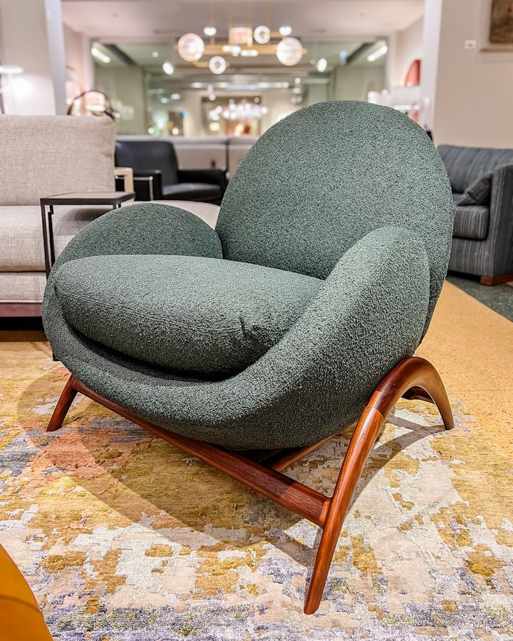 Designed by Rick Lee, this chair is defined by a soft, biomorphic modern shape that hugs for an unparalleled lounging experience. It is available in a variety of fabrics and can be customized to match any décor. It is shown on our Chicago showroom floor in natural walnut and an olive green fabric.