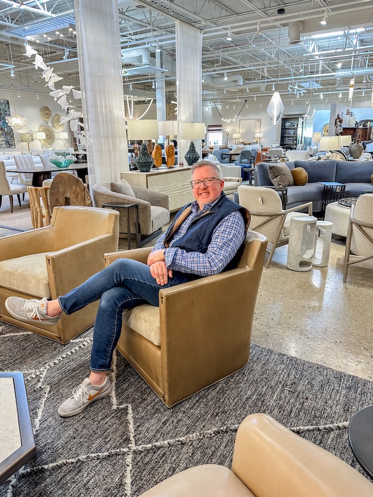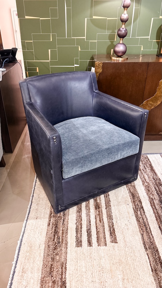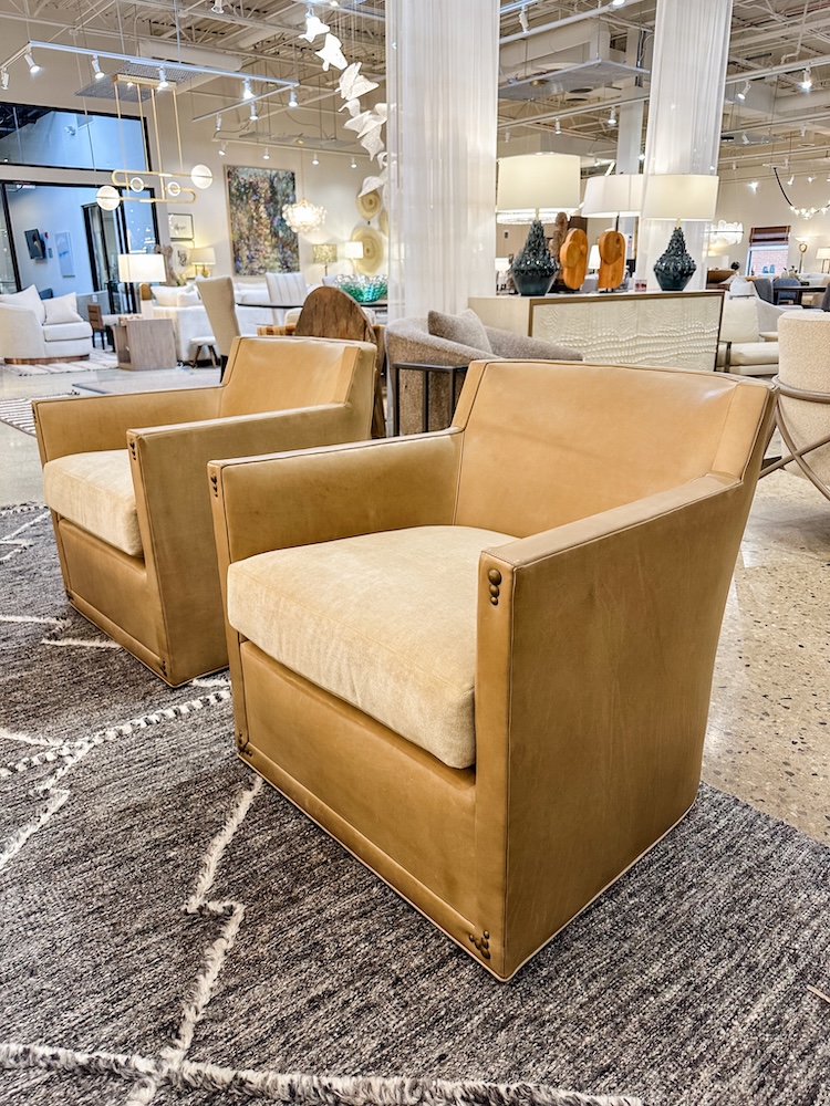 The Thedford Swivel Chair by Wesley Hall is my new favorite find. I love the comfort, the look, and the ability to do an easy combo! It is made in North Carolina by a family owned business abd offers a big sit with a small footprint. The piece on our Arlington Heights showroom floor features a nail head trim detail that I love. Its just enough!